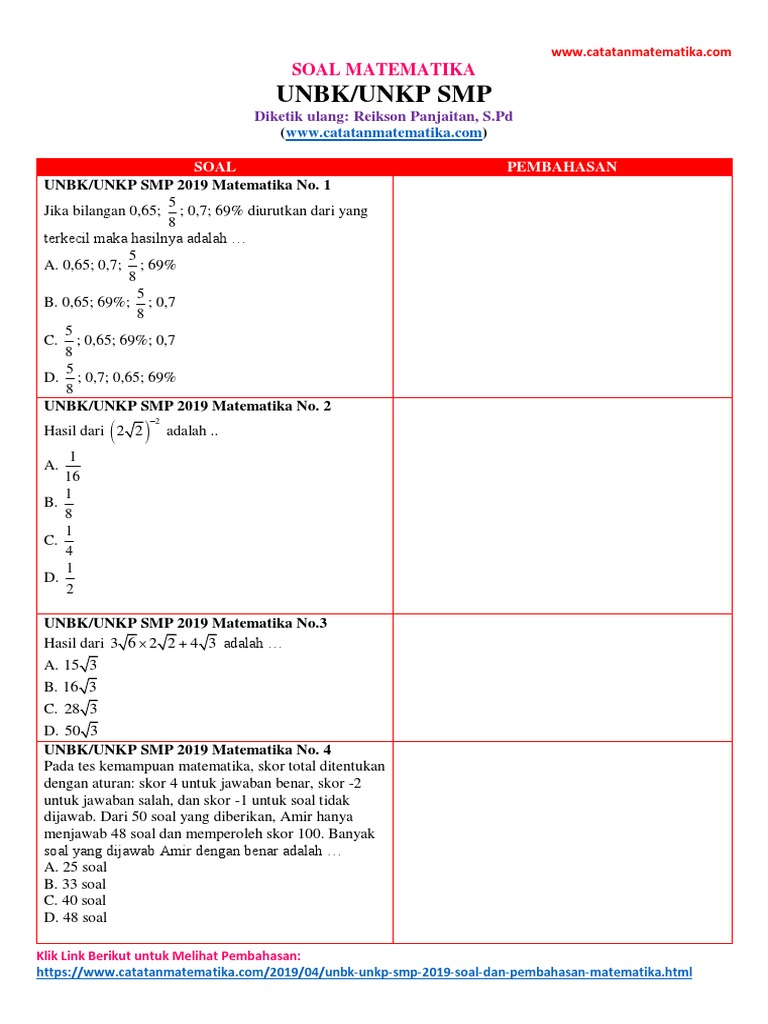 Soal Matematika Unbk Unkp Smp Tahun 2019
