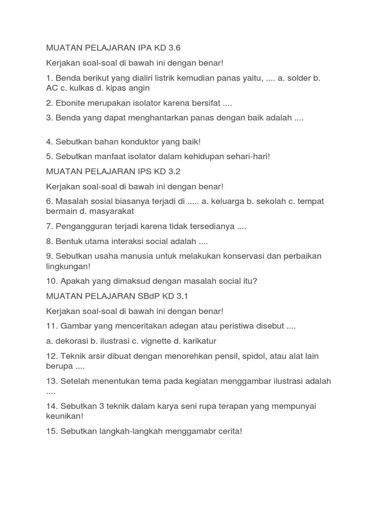 Jumlah soal ada 60. Soal UTS IPA kelas 6 SDMI 40 Contoh Soal UTS IPA kelas 6 SDMI dan Kunci Jawaban - Bagi Adik adik dimana saja berada yang ingin sekali mempelajari Soal UTS IPA kelas 6 SDMI ini adik adik bisa menguduh materi ini di bospedia dalam bentuk file doc. Soal Ujian Sekolah Bahasa Indonesia SD MI berjumlah 45 butir soal dengan rincian 40 butir soal Pilihan Ganda dan 5 butir Soal Uraian.