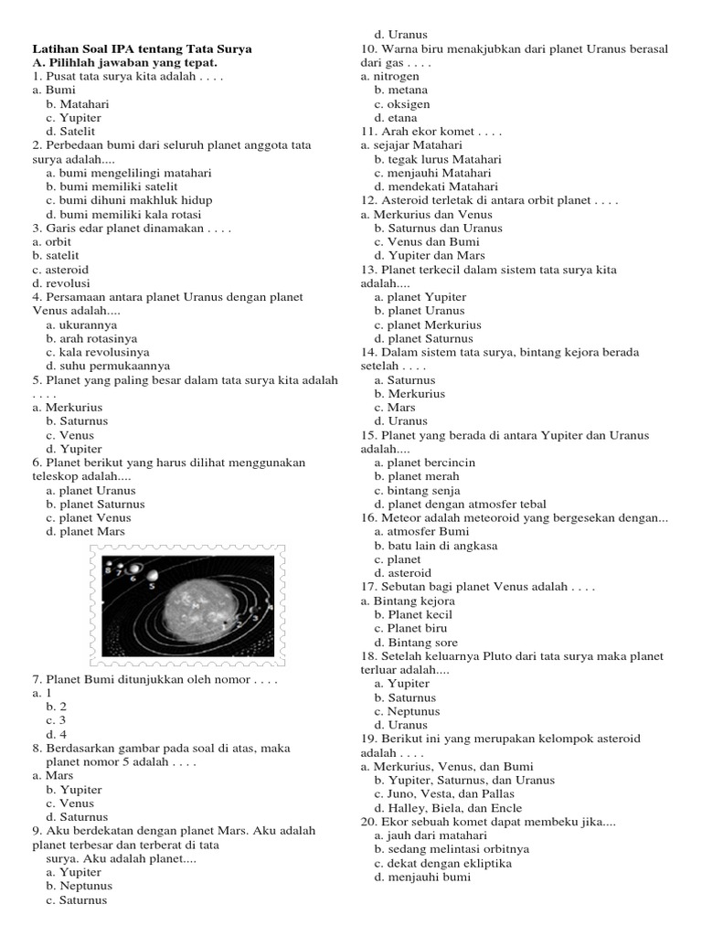 Pilihlah a b c atau d. Soal IPA Kelas 6 Sd Bab 8 Sistem Tata Surya - Www. Berikut ini admin bagikan ringkasan dan latihan soal UN IPA SMP MTs materi Tata Surya untuk membantu belajar peserta didik kelas IX sembilan dalam menghadapi Ujian Nasional IPA.