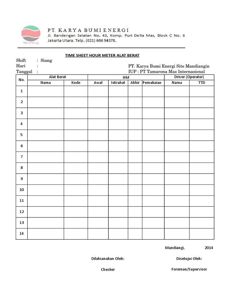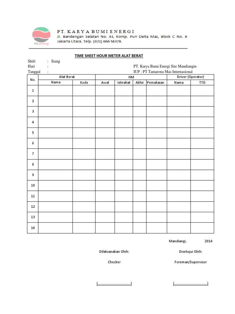 Timesheet alat berat. Kami ZamilConsultingCom hadir untuk menjadi solusi yang paling tepat untuk anda ZamilConsultingCom merupakan salah satu perusahaan yang berada di Yogyakarta yang bergerak dibidang Oil Gas Construction Services Learning Center. Contoh timesheet harian alat berat. Software Time Sheet Krishand Time Sheet sangat cocok digunakan oleh perusahaan jasa konsultan di dalam pencatatan dan pengontrolan aktivitas harian pemakaian waktu kerja dari masing-masing pegawai atas proyek-proyek yang sedang berjalan.