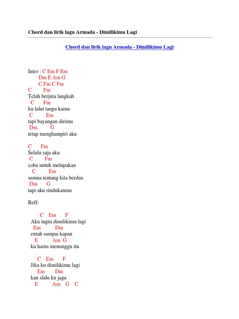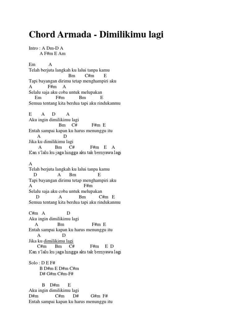 Dimilikimu lagi Am Gm kan slalu ku jaga A Dm C Bb hingga aku tak bernyawa lagi. Chord Gitar Kunci Gitar Indonesia - Dimilikimu Lagi by Armada - C F Am Bb Ku ingin. Adapun kunci gitar lagu Armada pada aplikasi ini antara lain.