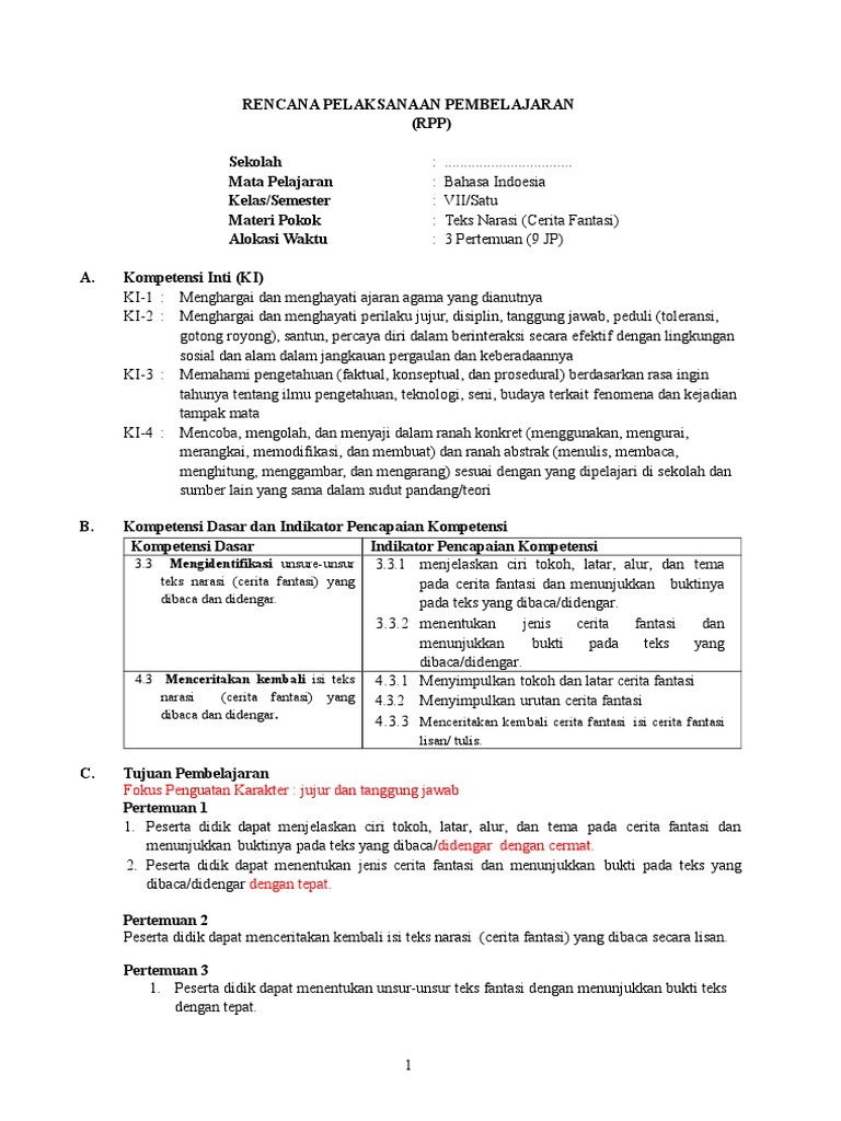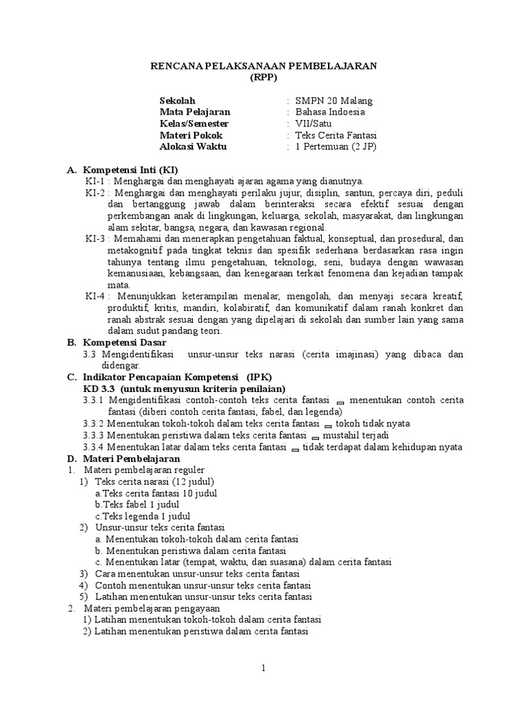 Oke menjelang tengah malam ini saya akan kembali membagikan RPP Bahasa Indonesia SMP kelas 7 berupa RPP Teks Cerita Fantasi. Kompetensi Inti KI KI-1. Membangun konteks untuk menumbuhkan sikap yang telah dirancang pada KD 2.